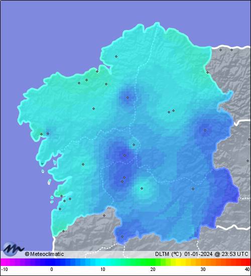 | 01-01-2024 | | | Máx. | Mín. | | | Temperatura | 12,7 | 8,6 | °C | | Humedad | 88 | 76 | % | | Viento | 43 | n/a | km/h | | Presión | 1.017 | 1.011 | hPa | | Precipitación | 0,0 | mm |