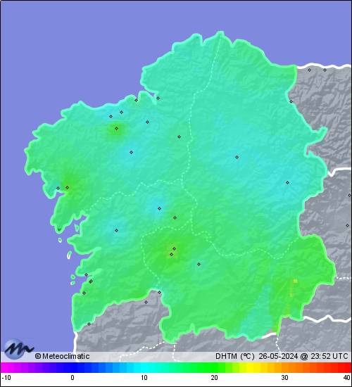 | 26-05-2024 | | | Máx. | Mín. | | | Temperatura | 18,2 | 9,8 | °C | | Humedad | 95 | 65 | % | | Presión | 1.026 | 1.021 | hPa | | Precipitación | 0,0 | mm |