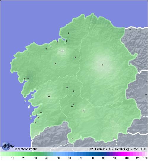 | 15-06-2024 | | | Máx. | Mín. | | | Temperatura | 18,8 | 13,3 | °C | | Humedad | 90 | 71 | % | | Viento | 29 | n/a | km/h | | Presión | 1.021 | 1.018 | hPa | | Precipitación | 0,0 | mm |