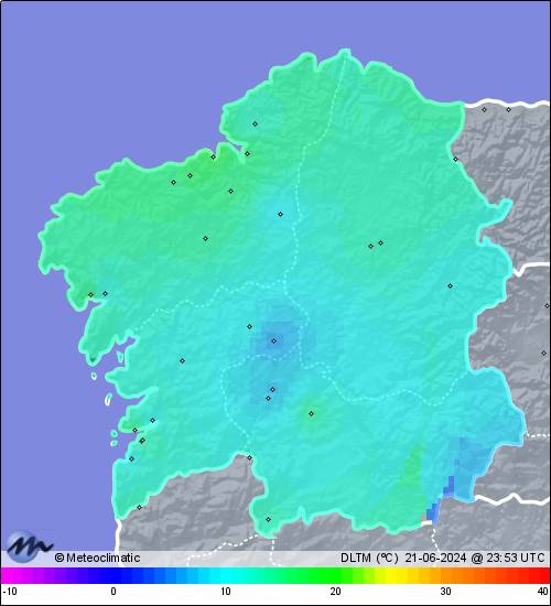| 21-06-2024 | | | Máx. | Mín. | | | Temperatura | 20,2 | 12,6 | °C | | Humedad | 88 | 52 | % | | Viento | 16 | n/a | km/h | | Presión | 1.023 | 1.019 | hPa |