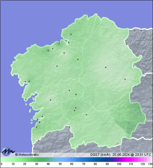 | 25-06-2024 | | | Máx. | Mín. | | | Temperatura | 19,3 | 16,6 | °C | | Humedad | 94 | 88 | % | | Viento | 45 | n/a | km/h | | Presión | 1.009 | 1.007 | hPa | | Precipitación | 0,0 | mm |