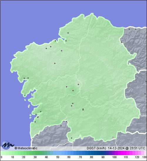 | 14-12-2024 | | | Máx. | Mín. | | | Temperatura | 16,3 | 7,5 | °C | | Humedad | 78 | 55 | % | | Viento | 19 | n/a | km/h | | Presión | 1.036 | 1.028 | hPa | | Precipitación | 0,0 | mm |