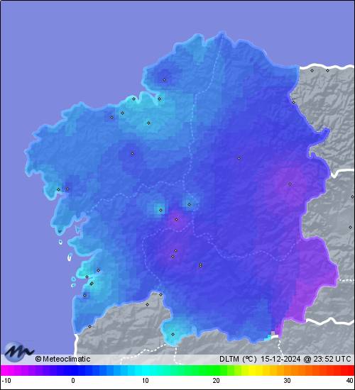 | 15-12-2024 | | | Máx. | Mín. | | | Temperatura | 9,3 | -1,3 | °C | | Humedad | 97 | 74 | % | | Viento | 13 | n/a | km/h | | Presión | 1.042 | 1.038 | hPa | | Precipitación | 0,0 | mm |