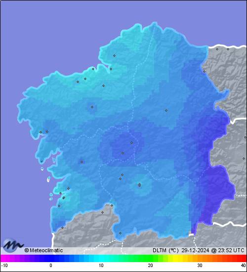 | 29-12-2024 | | | Máx. | Mín. | | | Temperatura | 12,3 | 5,3 | °C | | Humedad | 93 | 72 | % | | Viento | 10 | n/a | km/h | | Presión | 1.029 | 1.027 | hPa | | Precipitación | 0,0 | mm |