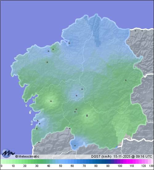 | Actualizado: 07:11 UTC | 9,7°C 92% | 10,1 °C / 92% | | 9,3°C / 91% | | 4 km/h SSE | | 40 km/h | | 999 hPa | | 14,2 mm |