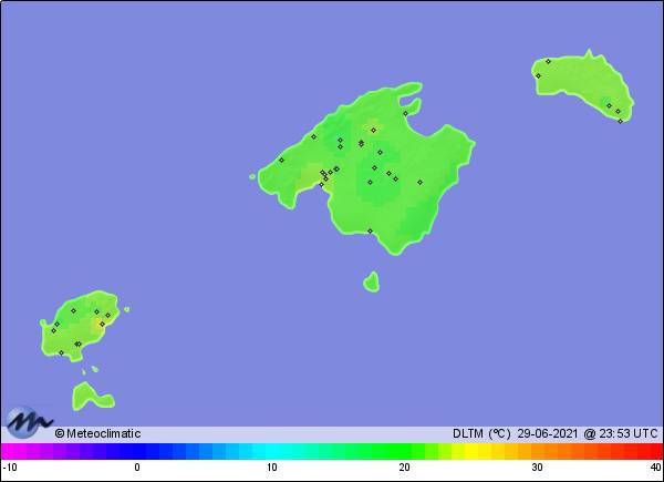 | 29-06-2021 | | | Máx. | Mín. | | | Temperatura | 29,4 | 18,1 | °C | | Humedad | 91 | 60 | % | | Viento | 17 | n/a | km/h | | Presión | 1.018 | 1.012 | hPa | | Precipitación | 0,0 | mm |