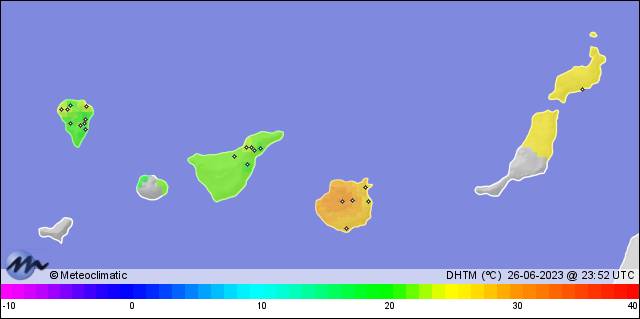 | 26-06-2023 | | | Máx. | Mín. | | | Temperatura | 24,3 | 19,7 | °C | | Humedad | 87 | 69 | % | | Viento | 29 | n/a | km/h | | Presión | 1.013 | 1.010 | hPa | | Precipitación | 0,0 | mm |