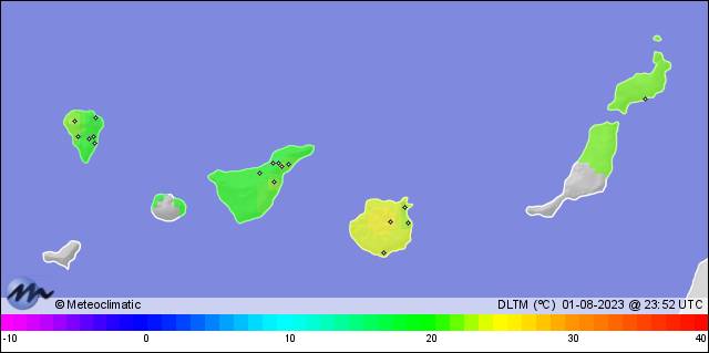 | 01-08-2023 | | | Máx. | Mín. | | | Temperatura | 28,0 | 21,8 | °C | | Humedad | 96 | 71 | % | | Viento | 35 | n/a | km/h | | Presión | 1.010 | 1.007 | hPa | | Precipitación | 0,0 | mm |