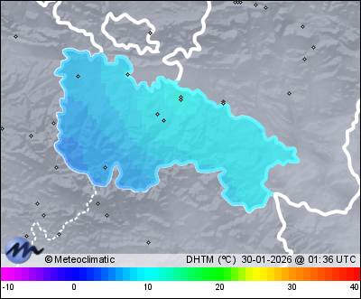 | Actualizado: 00:02 UTC | 6,4°C 76% | 10,2 °C / 94% |  | | 2,6°C / 68% | | 13 km/h E | | 68 km/h | | 1.008 hPa | | 3,9 mm |