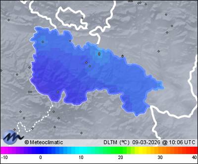 | Actualizado: 22:15 UTC | 6,6°C 92% | 9,6 °C / 93% | | 3,8°C / 82% | | 10 km/h NNE | | 42 km/h | | 1.013 hPa |