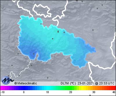 | 23-01-2021 | | | Máx. | Mín. | | | Temperatura | 9,3 | 6,0 | °C | | Humedad | 90 | 64 | % | | Viento | 39 | n/a | km/h | | Presión | 1.009 | 998 | hPa | | Precipitación | 3,2 | mm |