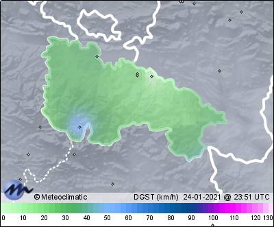 | 24-01-2021 | | | Máx. | Mín. | | | Temperatura | 7,8 | 3,9 | °C | | Humedad | 92 | 65 | % | | Viento | 53 | n/a | km/h | | Presión | 1.016 | 1.008 | hPa | | Precipitación | 10,9 | mm |