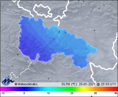 | 25-01-2021 | | | Máx. | Mín. | | | Temperatura | 9,6 | 0,8 | °C | | Humedad | 96 | 76 | % | | Viento | 29 | n/a | km/h | | Presión | 1.022 | 1.011 | hPa | | Precipitación | 37,0 | mm |