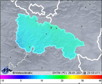 | 26-01-2021 | | | Máx. | Mín. | | | Temperatura | 12,5 | 2,5 | °C | | Humedad | 94 | 74 | % | | Viento | 26 | n/a | km/h | | Presión | 1.024 | 1.020 | hPa | | Precipitación | 0,0 | mm |