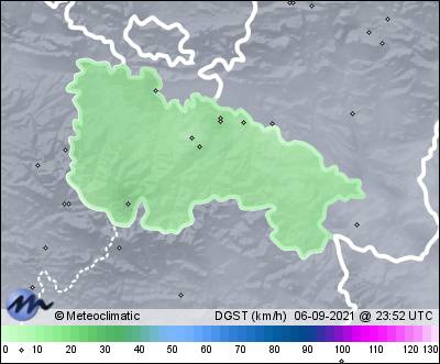 | 06-09-2021 | | | Máx. | Mín. | | | Temperatura | 29,6 | 19,0 | °C | | Humedad | 80 | 52 | % | | Viento | 32 | n/a | km/h | | Presión | 1.020 | 1.016 | hPa | | Precipitación | 0,0 | mm |