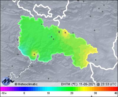 | 11-09-2021 | | | Máx. | Mín. | | | Temperatura | 22,7 | 12,8 | °C | | Humedad | 95 | 63 | % | | Viento | 23 | n/a | km/h | | Presión | 1.020 | 1.015 | hPa | | Precipitación | 0,0 | mm |