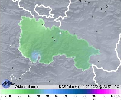 | 14-02-2022 | | | Máx. | Mín. | | | Temperatura | 12,3 | 6,0 | °C | | Humedad | 80 | 47 | % | | Viento | 53 | n/a | km/h | | Presión | 1.021 | 1.010 | hPa | | Precipitación | 1,2 | mm |