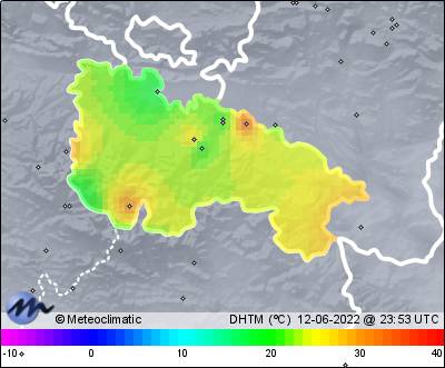 | 12-06-2022 | | | Máx. | Mín. | | | Temperatura | 30,3 | 12,4 | °C | | Humedad | 97 | 34 | % | | Viento | 34 | n/a | km/h | | Presión | 1.028 | 1.019 | hPa | | Precipitación | 0,0 | mm |
