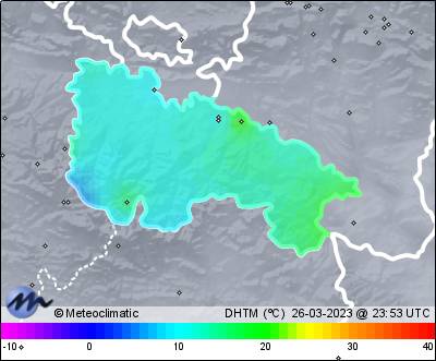 | 26-03-2023 | | | Máx. | Mín. | | | Temperatura | 18,6 | 9,4 | °C | | Humedad | 56 | 16 | % | | Viento | 60 | n/a | km/h | | Presión | 1.025 | 1.017 | hPa | | Precipitación | 0,0 | mm |