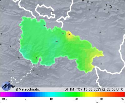 | 13-06-2023 | | | Máx. | Mín. | | | Temperatura | 19,7 | 10,7 | °C | | Humedad | 96 | 64 | % | | Viento | 29 | n/a | km/h | | Presión | 1.020 | 1.016 | hPa | | Precipitación | 28,0 | mm |
