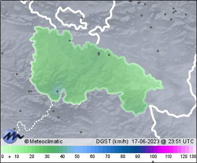 | 17-06-2023 | | | Máx. | Mín. | | | Temperatura | 30,2 | 12,9 | °C | | Humedad | 94 | 33 | % | | Viento | 42 | n/a | km/h | | Presión | 1.023 | 1.012 | hPa | | Precipitación | 0,3 | mm |