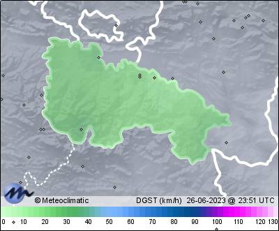 | 26-06-2023 | | | Máx. | Mín. | | | Temperatura | 22,2 | 15,4 | °C | | Humedad | 93 | 72 | % | | Viento | 35 | n/a | km/h | | Presión | 1.023 | 1.018 | hPa | | Precipitación | 0,0 | mm |