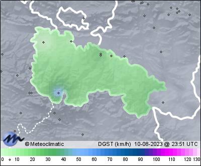 | 10-08-2023 | | | Máx. | Mín. | | | Temperatura | 33,0 | 21,3 | °C | | Humedad | 72 | 31 | % | | Viento | 34 | n/a | km/h | | Presión | 1.021 | 1.012 | hPa | | Precipitación | 0,0 | mm |