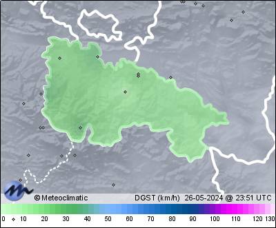 | 26-05-2024 | | | Máx. | Mín. | | | Temperatura | 20,0 | 9,6 | °C | | Humedad | 82 | 46 | % | | Viento | 45 | n/a | km/h | | Presión | 1.016 | 1.011 | hPa | | Precipitación | 0,0 | mm |