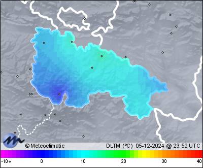 | 05-12-2024 | | | Máx. | Mín. | | | Temperatura | 14,0 | 0,7 | °C | | Humedad | 95 | 67 | % | | Viento | 26 | n/a | km/h | | Presión | 1.032 | 1.030 | hPa | | Precipitación | 0,0 | mm |