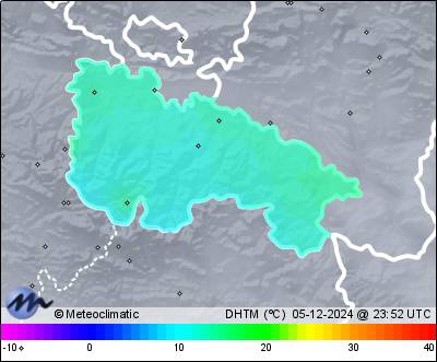 | 05-12-2024 | | | Máx. | Mín. | | | Temperatura | 14,0 | 0,7 | °C | | Humedad | 95 | 67 | % | | Viento | 26 | n/a | km/h | | Presión | 1.032 | 1.030 | hPa | | Precipitación | 0,0 | mm |