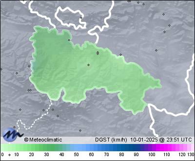 | 10-01-2025 | | | Máx. | Mín. | | | Temperatura | 11,0 | 9,1 | °C | | Humedad | 93 | 75 | % | | Viento | 35 | n/a | km/h | | Presión | 1.029 | 1.026 | hPa | | Precipitación | 0,0 | mm |