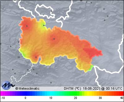 | 17-08-2025 | | | Máx. | Mín. | | | Temperatura | 38,4 | 19,7 | °C | | Humedad | 86 | 18 | % | | Viento | 39 | n/a | km/h | | Presión | 1.010 | 1.007 | hPa | | Precipitación | 0,4 | mm |