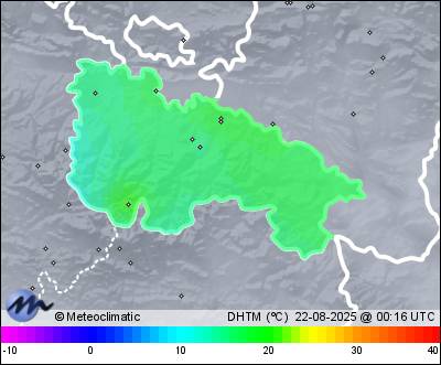 | 21-08-2025 | | | Máx. | Mín. | | | Temperatura | 18,4 | 14,4 | °C | | Humedad | 84 | 73 | % | | Viento | 40 | n/a | km/h | | Presión | 1.018 | 1.012 | hPa | | Precipitación | 0,0 | mm |