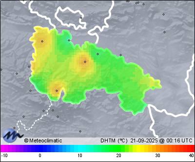 | 20-09-2025 | | | Máx. | Mín. | | | Temperatura | 29,2 | 14,6 | °C | | Humedad | 95 | 33 | % | | Viento | 39 | n/a | km/h | | Presión | 1.027 | 1.017 | hPa | | Precipitación | 0,8 | mm |