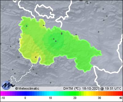 Actualizado: 11:40 UTC | 17,4°C 78% | 17,9 °C / 91% | 6,8°C / 76% | | 3 km/h WSW | 13 km/h | 1.020 hPa |