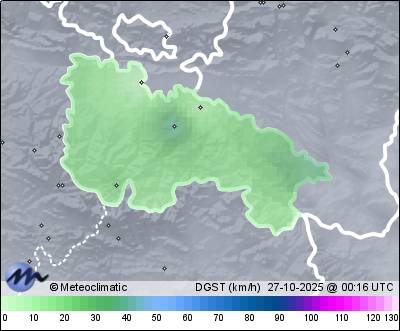 | 26-10-2025 | | | Máx. | Mín. | | | Temperatura | 14,4 | 9,3 | °C | | Humedad | 79 | 55 | % | | Viento | 34 | n/a | km/h | | Presión | 1.021 | 1.015 | hPa | | Precipitación | 0,0 | mm |