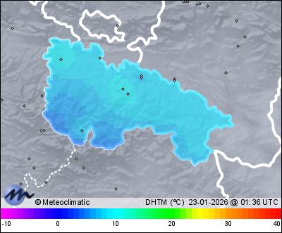 | Actualizado: 00:08 UTC | 6,8°C 75% | 6,8 °C / 77% |  | | 6,2°C / 75% | | 6 km/h NE | | 26 km/h | | 995 hPa |