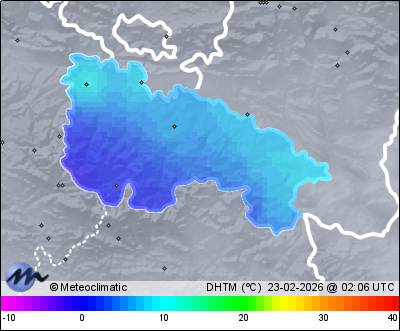 | Escarcha | | Actualizado: 00:25 UTC | -3,8°C 93% | -3,6 °C / 93% | | -3,8°C / 90% | | Calma | | 4 km/h | | 1.033 hPa |