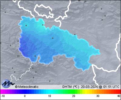| Actualizado: 00:20 UTC | 6,0°C 80% | 6,0 °C / 88% | | 4,8°C / 80% | | 10 km/h SE | | 23 km/h | | 1.012 hPa |
