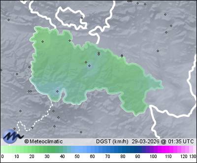 | Actualizado: 00:29 UTC | 1,6°C 64% | 1,8 °C / 64% | | 1,5°C / 62% | | 41 km/h N | | 57 km/h | | 1.030 hPa |