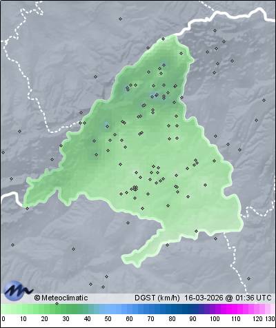 | Actualizado: 23:43 UTC | 4,6°C 85% | 16,1 °C / 97% | | -1,4°C / 45% | | Calma | | 11 km/h | | 1.025 hPa |