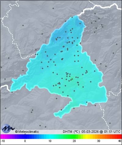 | Actualizado: 10:13 UTC | 9,7°C 84% | 9,7 °C / 94% | | 1,7°C / 83% | | Calma | | 5 km/h | | 0,8 mm |