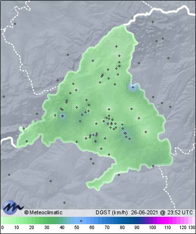 | 26-06-2021 | | | Máx. | Mín. | | | Temperatura | 32,7 | 18,7 | °C | | Humedad | 67 | 23 | % | | Viento | 39 | n/a | km/h | | Presión | 1.014 | 1.010 | hPa | | Precipitación | 0,0 | mm |