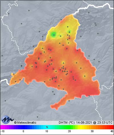 | 14-08-2021 | | | Máx. | Mín. | | | Temperatura | 37,9 | 22,2 | °C | | Humedad | 64 | 17 | % | | Viento | 35 | n/a | km/h | | Presión | 1.017 | 1.013 | hPa | | Precipitación | 3,2 | mm |