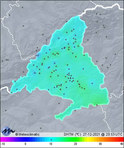 | 27-12-2021 | | | Máx. | Mín. | | | Temperatura | 13,8 | 9,6 | °C | | Humedad | 98 | 64 | % | | Viento | 48 | n/a | km/h | | Presión | 1.021 | 1.012 | hPa | | Precipitación | 0,4 | mm |
