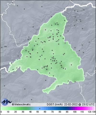 | 22-02-2022 | | | Máx. | Mín. | | | Temperatura | 19,6 | 5,7 | °C | | Humedad | 32 | 12 | % | | Viento | 37 | n/a | km/h | | Presión | 1.033 | 1.025 | hPa | | Precipitación | 0,0 | mm |