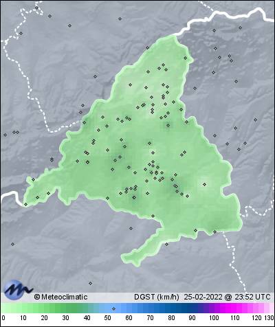 | 25-02-2022 | | | Máx. | Mín. | | | Temperatura | 12,1 | 5,8 | °C | | Humedad | 88 | 41 | % | | Viento | 37 | n/a | km/h | | Presión | 1.025 | 1.021 | hPa | | Precipitación | 3,0 | mm |