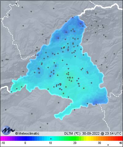 | 30-09-2022 | | | Máx. | Mín. | | | Temperatura | 18,9 | 9,2 | °C | | Humedad | 72 | 37 | % | | Viento | 40 | n/a | km/h | | Presión | 1.024 | 1.013 | hPa | | Precipitación | 0,0 | mm |