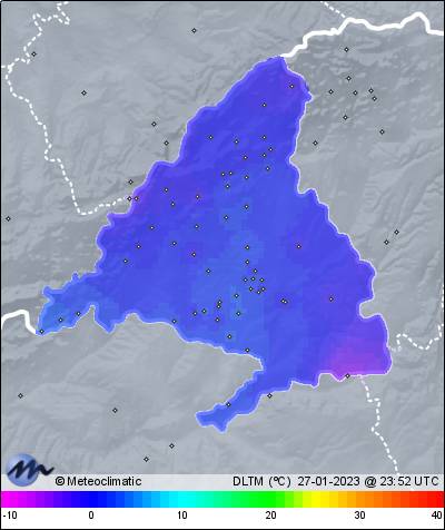 | 27-01-2023 | | | Máx. | Mín. | | | Temperatura | 10,1 | -0,9 | °C | | Humedad | 80 | 37 | % | | Viento | 32 | n/a | km/h | | Precipitación | 0,0 | mm |