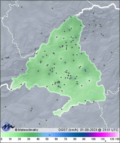 | 01-09-2023 | | | Máx. | Mín. | | | Temperatura | 30,3 | 15,6 | °C | | Humedad | 52 | 30 | % | | Viento | 34 | n/a | km/h | | Presión | 1.013 | 1.007 | hPa | | Precipitación | 0,0 | mm |